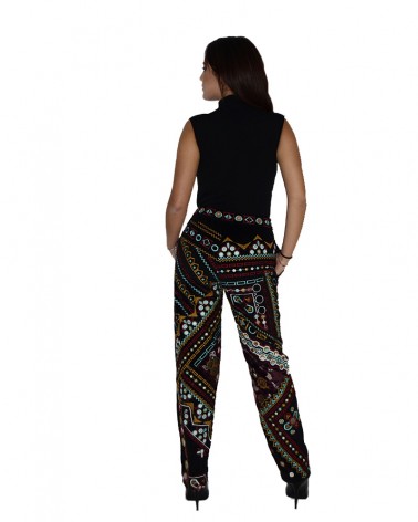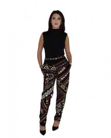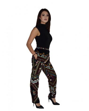 Nuovi pantaloni donna con esclusive decorazioni eleganti per occasioni formali ed eventi particolari. Disponibile anche il poncho abbinato.