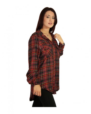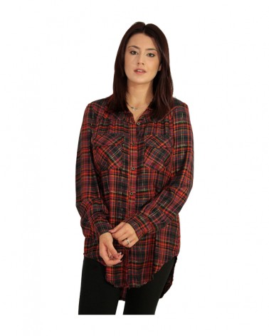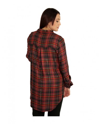 Camicia effetto tartan a quadri disponibili nelle colorazioni beige e gradazioni marroni e rosso e nero. Entrambe hanno degli insirti di fili dorati nelle trame a quadri. Chiusura con bottoni.