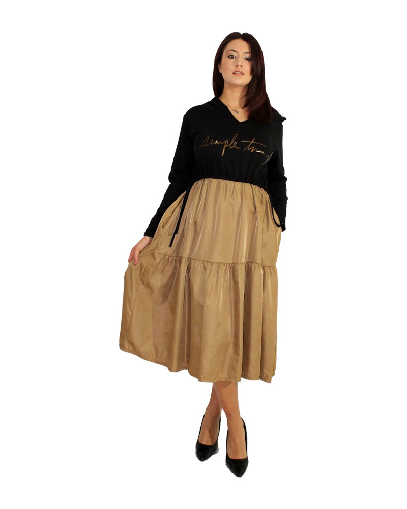 Un vestito stravagante e alla moda, molto casual e versatile: elegante con le decolletè, casual con un paio di anfibi. La parte superiore tessuto felpa con cappuccio. Dalla vita in giù, il tessuto dorato a balze impreziosisce l'outfit. La modella è alta 1.75m