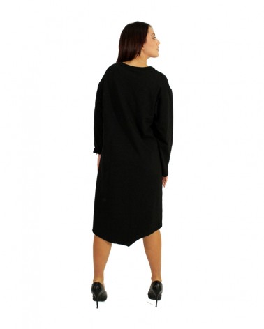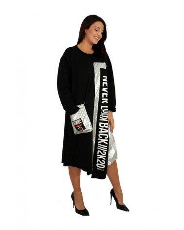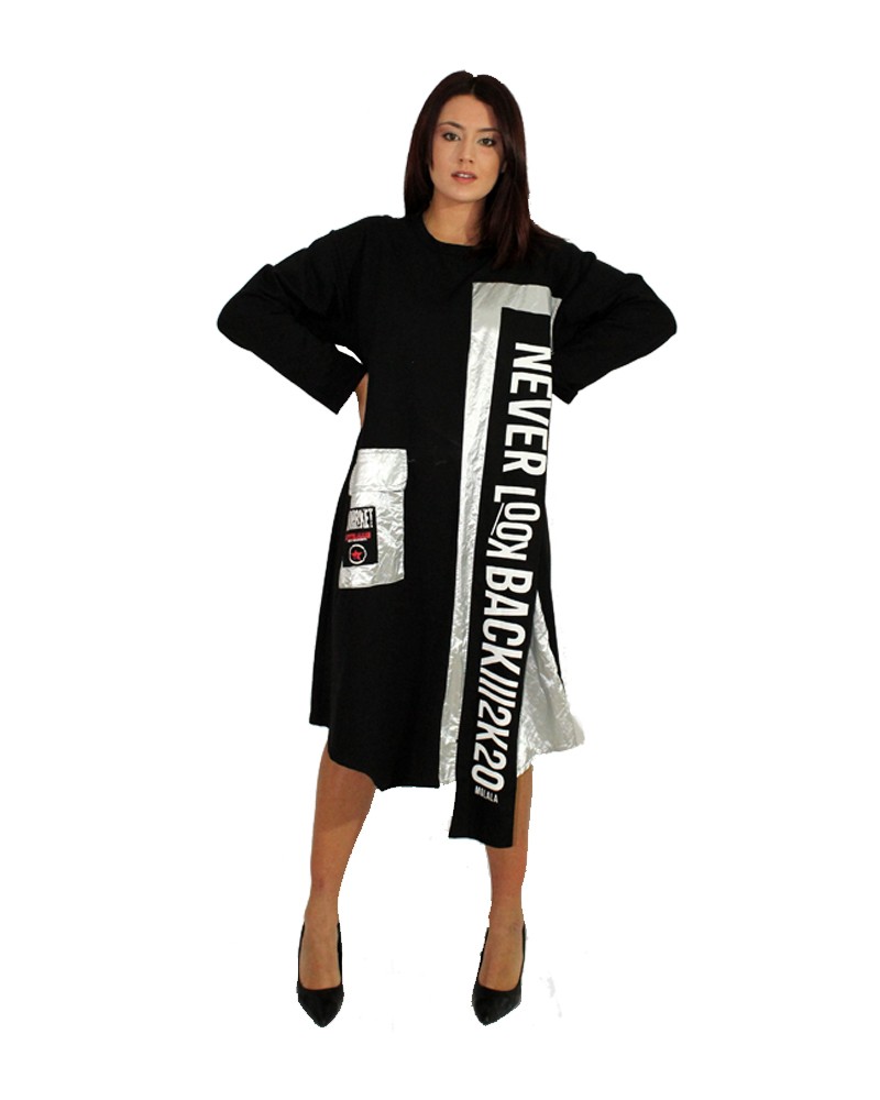Nuovo abito in tessuto felpato, vestibilità non attillato, scivola sul corpo leggermente oversize. Tasca sul fronte argentata che richiama l'inserto laterale in tessuto argento lucido. Una scritta lunga attraversa l'abito con un piccolo inserto più lungo rispetto a tutto l'abito.