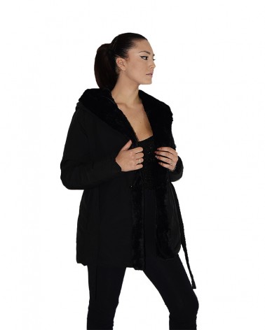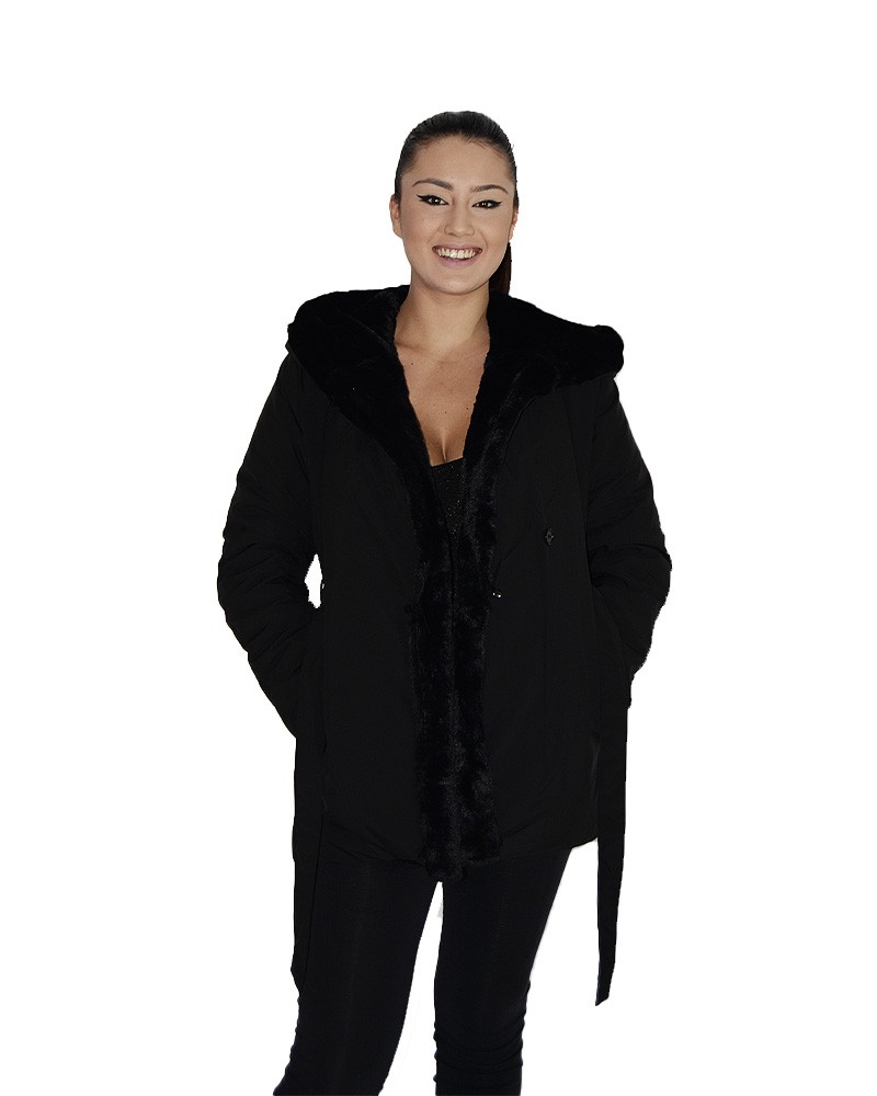 - Dettagli sull'abbottonatura e sul cappuccio in ecopelliccia