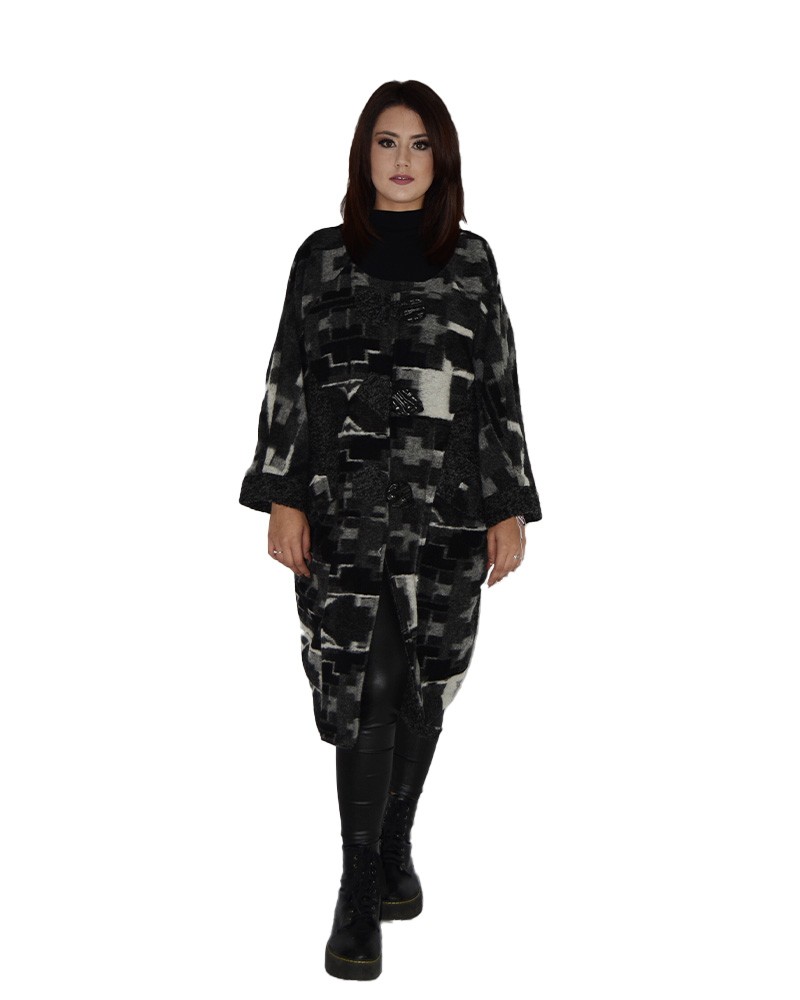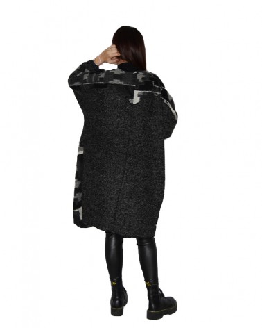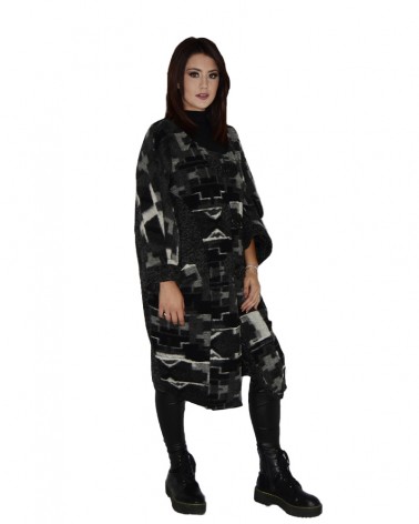 Un caldo cappotto in misto lana con fantasie patchwork sul fronte dai toni del grigio, nero e bianco. Il retro, realizzato effetto plaid non presenta fantasie geometriche.