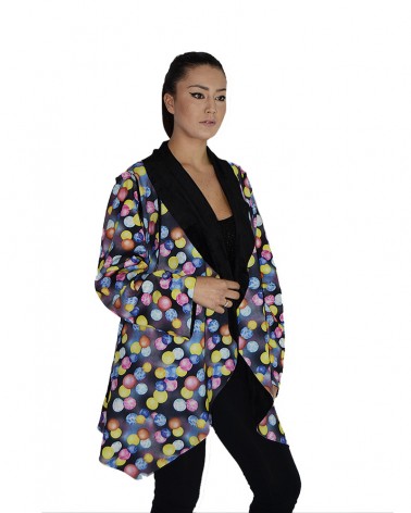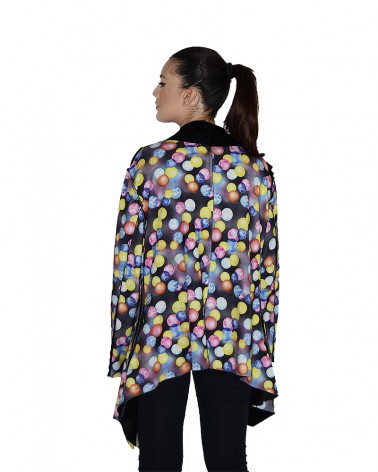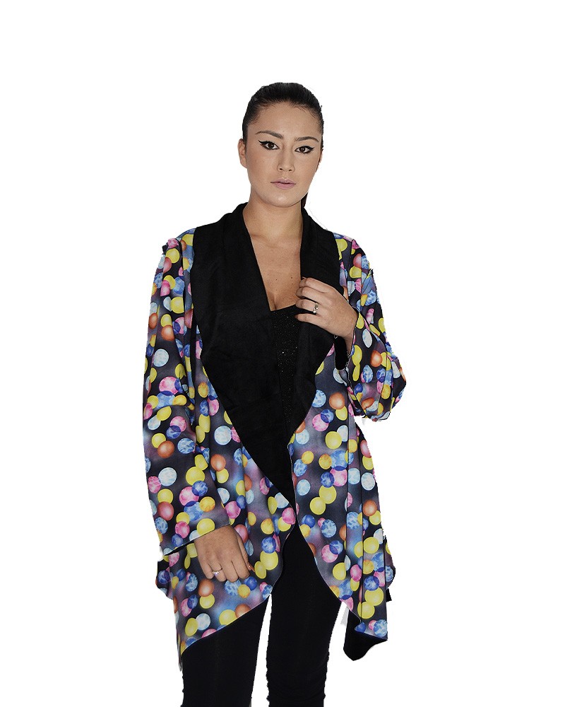 Giacca dalla fantasia multicolor, dalla linea morbida, con collo ampio di colore nero.