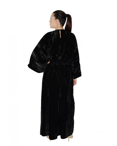 Abito lungo realizzato in velluto nero, dalla linea ampia, con manica lunga.