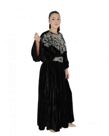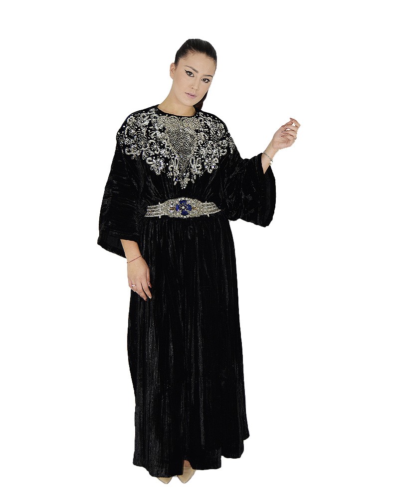 Abito ampio in velluto nero con ricami argento