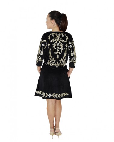 Gonna a mezza ruota sopra ginocchio, realizzata in velluto ed impreziosita dai ricami color argento!