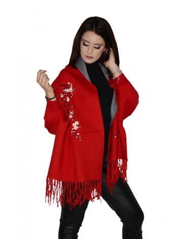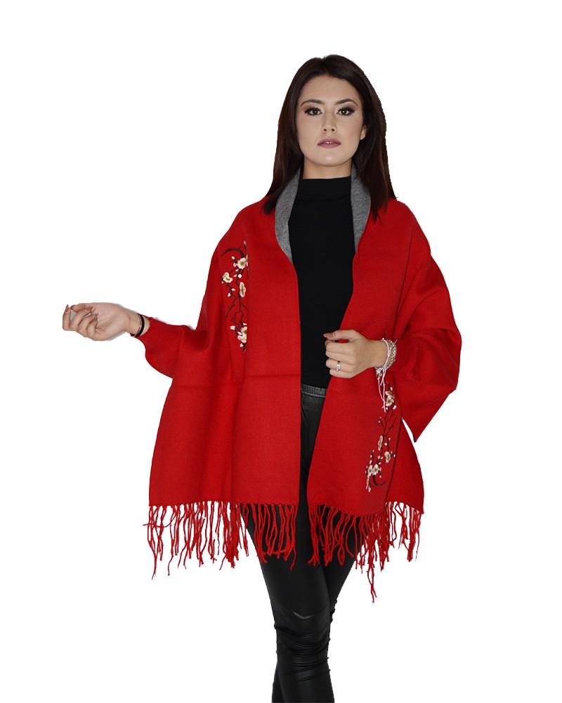 Poncho mantella con ricamo floreale e frange