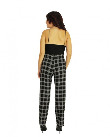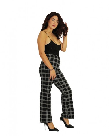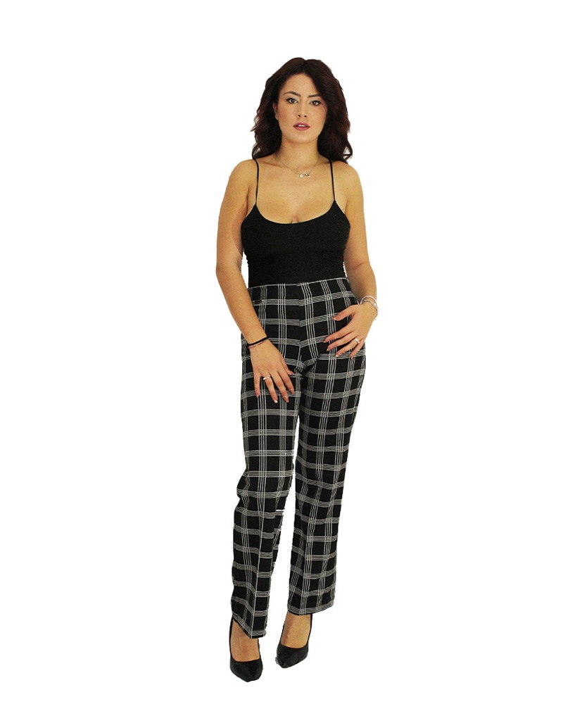 Pantalone a vita alta donna con richiamo a quadri disponibile anche nella versione 7/8 con taglio sopra la caviglia. Dalle fantasie geometriche, il contrasto nero e bianco rende questo capo elegante e senza tempo. Molto versatile passa dall'elegante al casual. Tessuto leggero ideale per primavera o autunno.