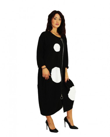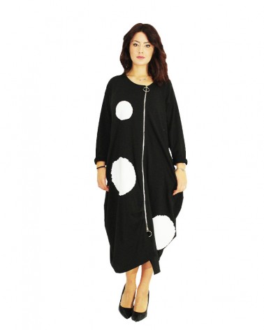 Un abito casual e alla moda il nuovo Jersey oversize! La nuova collezione autunno/inverno 2020/21 Mior include anche questo meraviglioso abito realizzato con il tessuto simil felpa, taglia unica modello oversize. Chiusura con doppia zip frontale che, oltre alla sua funzione, aggiunge un tocco casual al capo. Total black decorato con figure geometriche a contrasto.